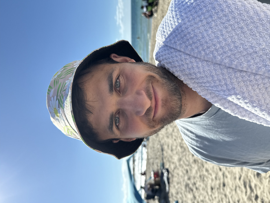 A close-up, chest-up portrait depicts a male individual on a beach in Unknown, Unknown, under bright, clear conditions