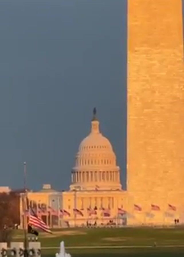 Washington Monument and U.S. Capitol Building from across the reflecting pool. The camera slowly zooms out from a close up of the buildings, and in the background people can be seen walking along a walkway. The monuments reflect in the water. The sky is dark gray.