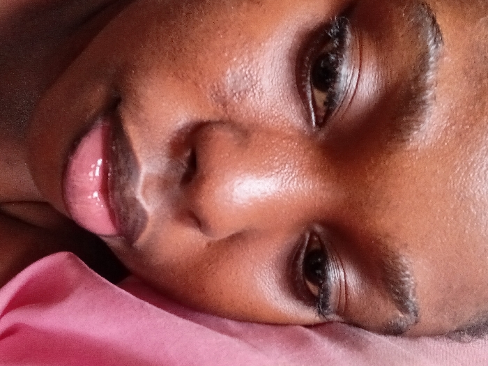 A close-up, angled portrait shot depicts the face of an individual with dark skin pigmentation, resting on pink fabric. The head is tilted, positioning the left side of the face higher than the right, with the top of the head towards the upper right of the frame. The individual's eyes are partially open, revealing dark irises and defined eyebrows. The nose is visible in the central facial area. The lips are slightly parted, coated with a glossy, light pink substance, reflecting ambient light. The skin exhibits a subtle sheen across the forehead and around the mouth area. No specific location details are identifiable within the image; the scene is consistent with an indoor environment. The location is Unknown, Unknown.