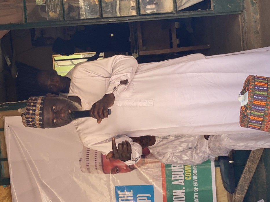 An adult male stands centrally, speaking into a black microphone held in his right hand. He has a grey beard and wears a white traditional tunic and trousers, with a patterned cap (kufi) featuring brown, beige, and black geometric designs. His left hand is extended forward and slightly downward, with the index finger pointing. Behind him to the left, a white banner with green and blue accents displays partially visible text including "THE (P)", "TION. ABUB", "COMM", and "MINISTRY OF ENVIRONMENT". An image of another man wearing a similar cap is visible on the banner. Partially obscured by the main speaker, another adult male in a white patterned garment is seated to the left. In the lower right foreground, a multicolored patterned cap rests on a light-colored object. To the right of the main speaker, an open doorway or archway reveals a darker interior. A blurry male figure in a light-colored top is partially visible within this opening, observing the speaker. Further back, a dark silhouette of another person and a wooden table or desk with a chair are discernible. A ceiling fan is faintly visible above the doorway. The scene appears to be an indoor or semi-open setting, likely a community gathering, in Kawo, Nigeria.