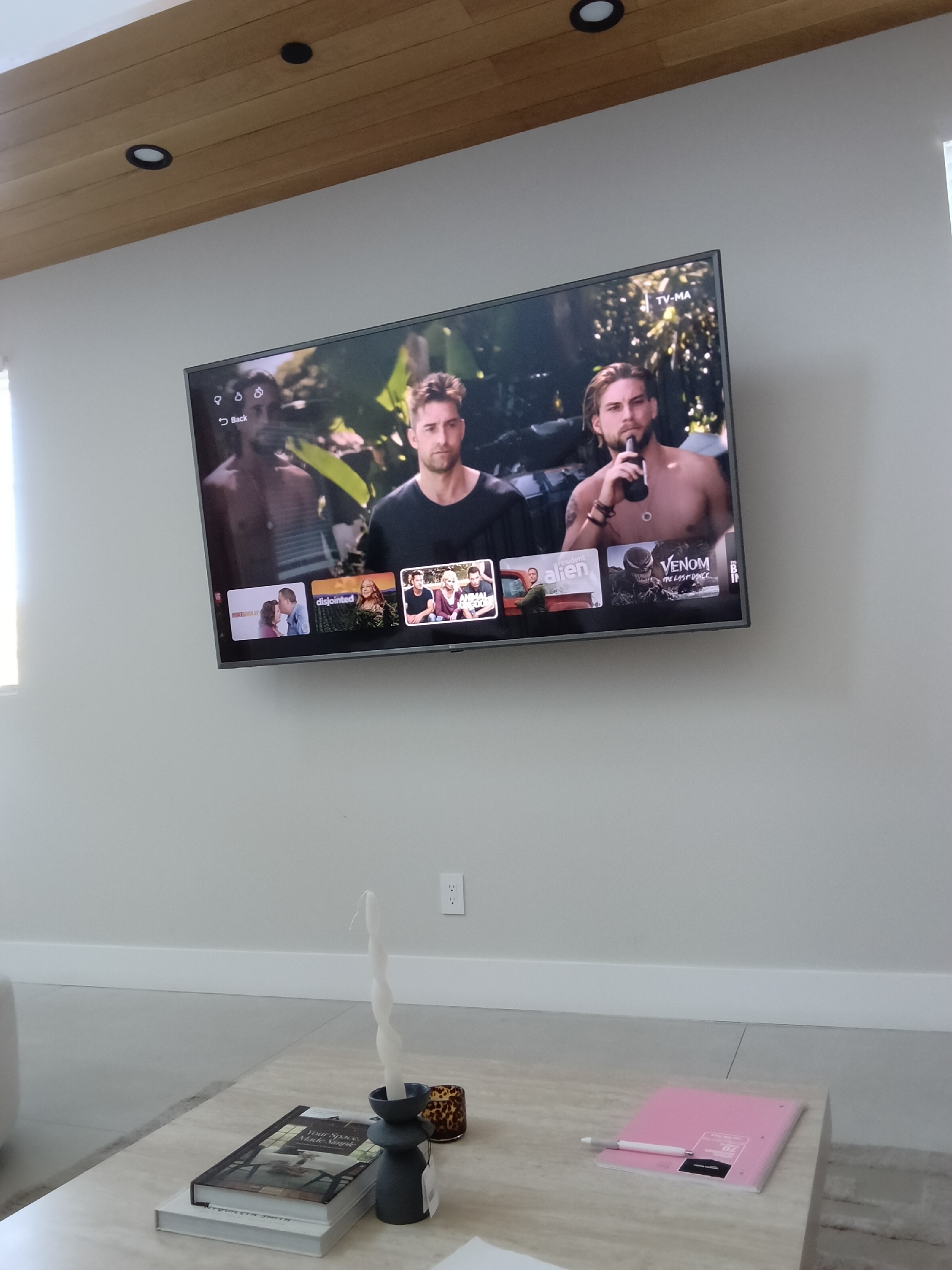 Here is a detailed description of the image: **Scene:** A living room setting featuring a modern, minimalist design. **Objects:** * A large, flat-screen television mounted on a light gray wall, displaying a streaming service menu. The thumbnails for several movies and shows are visible, including "Mike & Molly", "disjointed", "alien", and "Venom". * A light-colored coffee table with several items on it, including: * A stack of books with the top book titled "Your Space. Made Simple" * A small gray decorative vase and a candle. * A pink notebook with a pen lying on top. * An electrical outlet located on the wall below the TV. * A light wood ceiling with recessed lighting. * A white baseboard running along the bottom of the wall. * Part of a white sofa or chair is visible in the lower left corner. **Subjects:** * The TV screen displays two men. **Environment:** * The overall environment suggests a modern home with a clean and uncluttered aesthetic. The color palette is primarily neutral, with shades of gray, white, and light wood.
