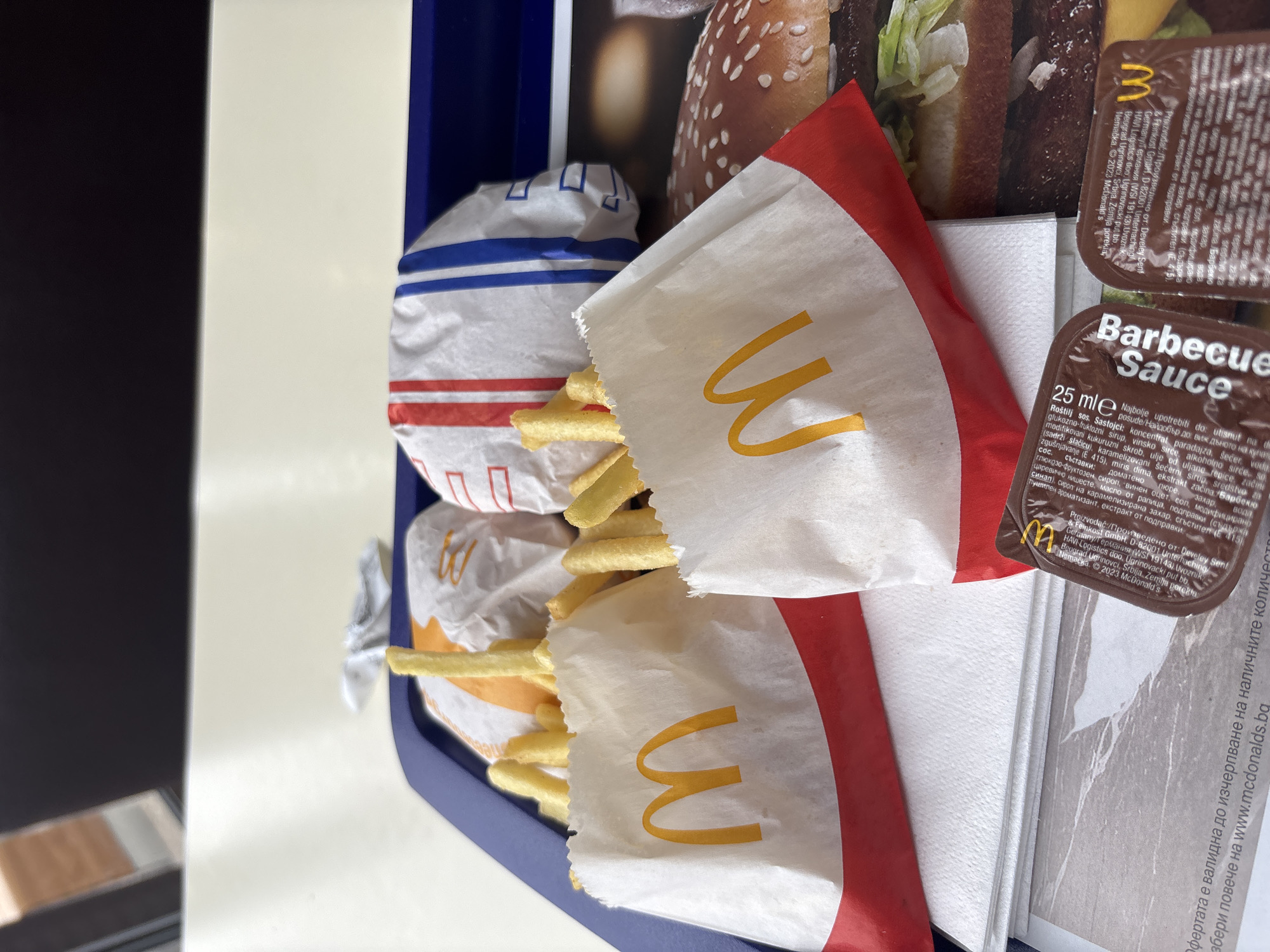 - "A high-angle photograph captures a McDonald's meal arranged on a blue plastic tray, resting on a white table surface within a McDonald's restaurant in Studena, Bulgaria" by FM-CeNIq2, licensed under CC BY 4.0