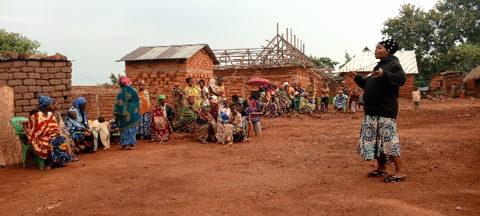 A group of women and children gather on a red-earth ground in an African village. The women are dressed in vibrant patterned clothing, some seated in chairs, others standing. A woman in a black hooded sweatshirt and patterned skirt stands apart, gesturing as if speaking to the group. Behind them are simple brick buildings, one with a partially constructed roof framework. The scene suggests a community meeting or gathering in a rural setting.