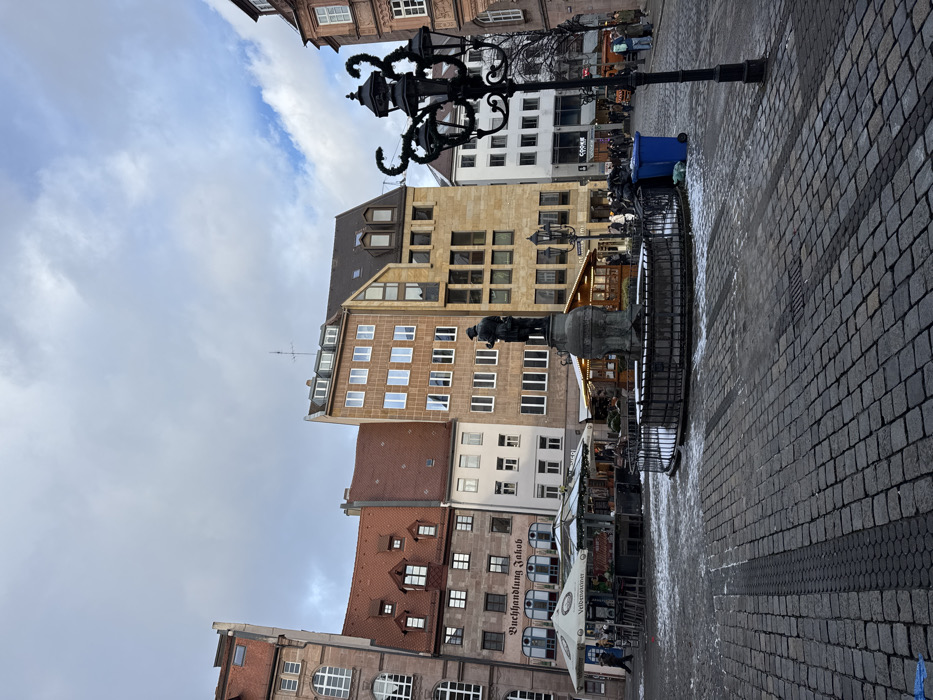 This image depicts Hans-Sachs-Platz in Nuremberg, Germany, under an overcast sky with patches of blue