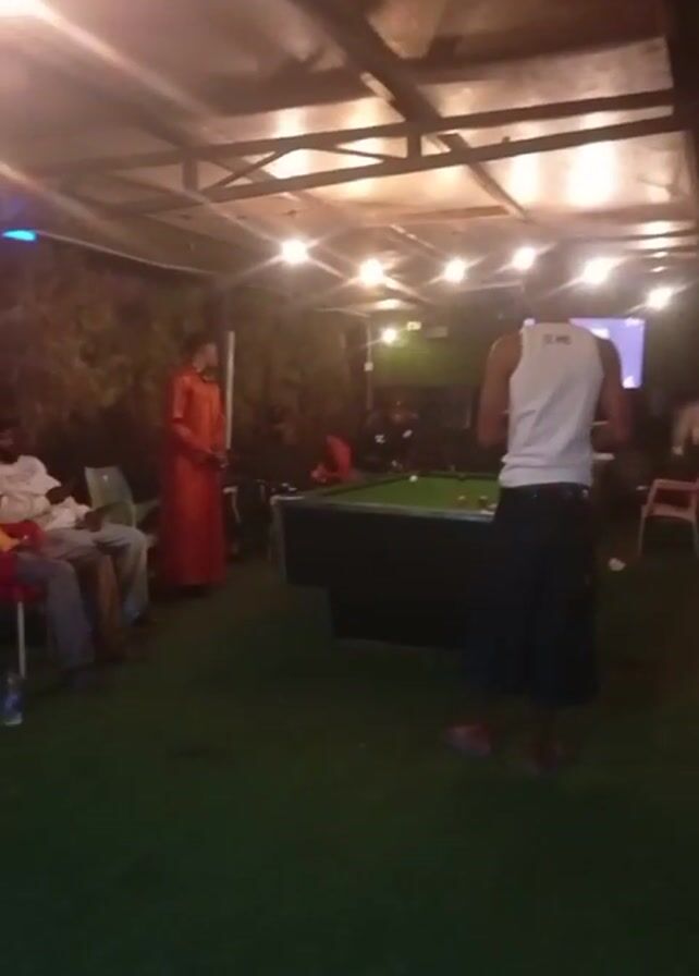 n informal outdoor gathering under a covered structure. Several people are present, including a man in a white tank top standing near a pool table. Another person is wearing a long orange garment and standing near the side of the covered area. A group of people are sitting on chairs near a wall, while others are near the pool table. The area is lit by string lights hanging from the ceiling. The floor is covered with artificial turf. The general impression is one of casual socializing and recreation.