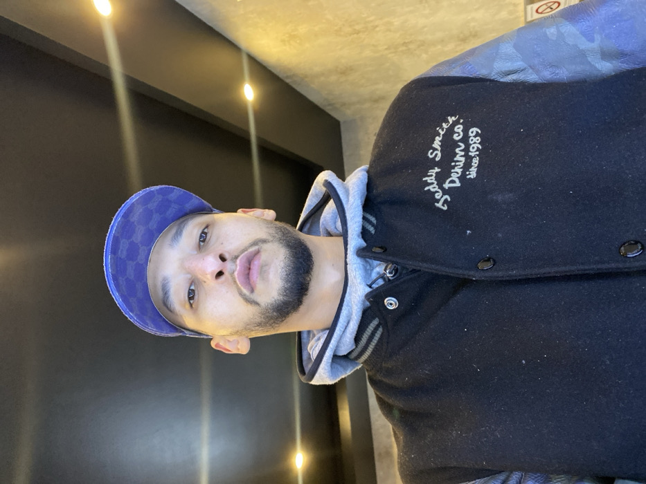 A man wearing a blue patterned baseball cap is pictured from a low angle. He has a beard and mustache. The man is wearing a black varsity jacket with a gray hooded sweatshirt underneath. The jacket has white lettering that says "Teddy Smith Denim Co. Since 1989." There are lights in the background, and the wall is black. The image is rotated slightly.