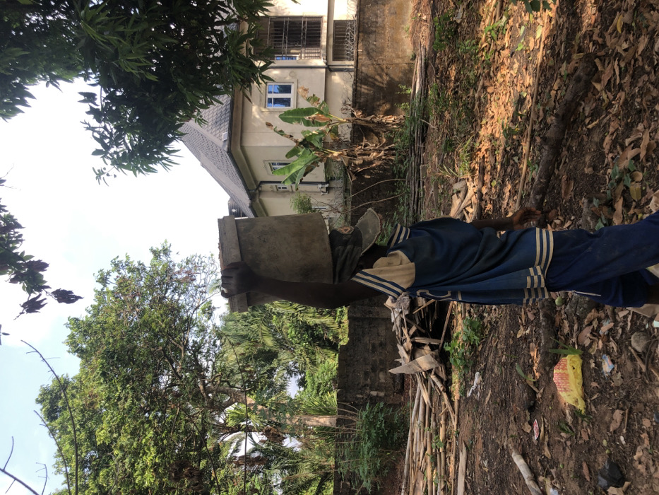 The scene, situated in Alor, Nigeria, captures an outdoor environment under bright daylight. A dark-skinned individual, observed in profile facing right, is centrally positioned, carrying a heavy-looking, rectangular, light-grey concrete object on their head, supported by both hands. The individual wears a faded dark cap beneath the object, a blue short-sleeved t-shirt with white stripes on the sleeves, and blue trousers. The ground is uneven, reddish-brown earth, sparsely covered with dry leaves, small green plants, and scattered refuse, including a prominent yellow plastic bag. To the left and behind the individual, a substantial pile of construction debris is visible, composed of bamboo poles and various wooden planks. A concrete block wall runs horizontally across the midground. In the background, a light-colored, multi-story residential building with a dark grey tiled roof is present, featuring several windows, some with a reflective blue tint, and a ground-floor window protected by dark security bars. Multiple large-leafed plants, resembling banana trees, grow near the building. Lush green trees, including palm trees, dominate the left side and upper background of the frame, with some leafless branches visible against a clear, bright sky.