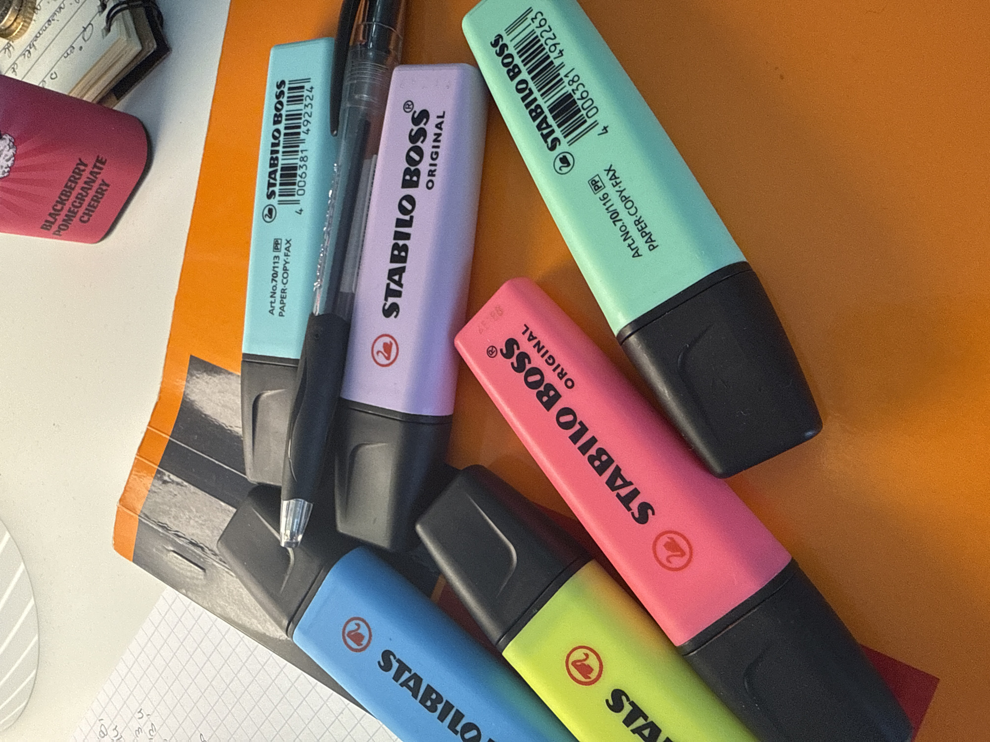 The scene depicts a desktop surface in Neuilly-sur-Seine, France. The foreground features five STABILO BOSS ORIGINAL highlighters with black caps, colored blue, lime green, hot pink, lavender, and mint green, arranged in an overlapping configuration. A black ballpoint pen rests diagonally across the light blue and lavender highlighters. Directly beneath several highlighters is an orange notebook or folder. To the upper left, a white grid paper with handwritten numerical calculations is partially visible. In the upper right, a pink cylindrical container labeled "BLACKBERRY POMEGRANATE CHERRY" stands next to a small, open, spiral-bound notebook displaying handwritten text and several stacked gold-colored coins. The background is a white, flat surface. No individuals are depicted.