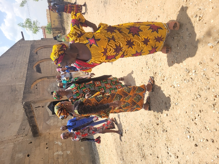 The image depicts a scene in Suleja, Nigeria, on a dry, light brown dirt path interspersed with small stones, under a bright, partially visible sky. A weathered, light brown concrete block building featuring three arched lower-level openings serves as the primary background structure on the left. Approximately 10-15 individuals are present, predominantly women, dressed in brightly patterned fabric attire and headscarves. In the immediate foreground, three women are central: one, positioned with her back partially to the viewer, wears an orange and black patterned long dress; another, facing left, wears a green, black, and orange patterned long dress and glasses; and an older woman on the right, in a vibrant yellow dress with red star-like patterns and a matching yellow and red headscarf, stands with her left hand on her hip, looking intently towards the left. All visible individuals in the foreground wear flat sandals. Further back, a man in a blue long-sleeved shirt and trousers is visible among other individuals, primarily women in similar patterned clothing. Some figures are walking further down the path towards the right background, where a small, sparse tree and another distant building are visible. The individuals appear to be standing or moving along the unpaved path.