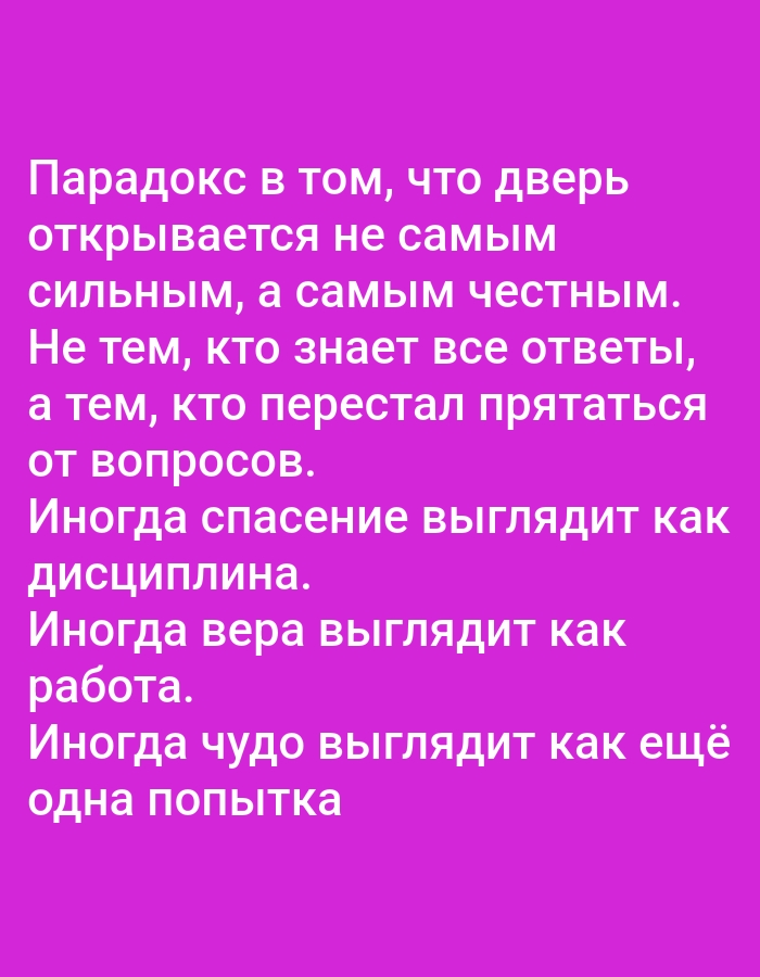 The image displays text in Russian against a solid purple background. The text is an inspirational message. It states that a door opens for the most honest, not the strongest. It is for those who don't hide from questions, rather than those who have all the answers. The text continues by saying that salvation can look like discipline, faith can look like work, and a miracle can look like another attempt.