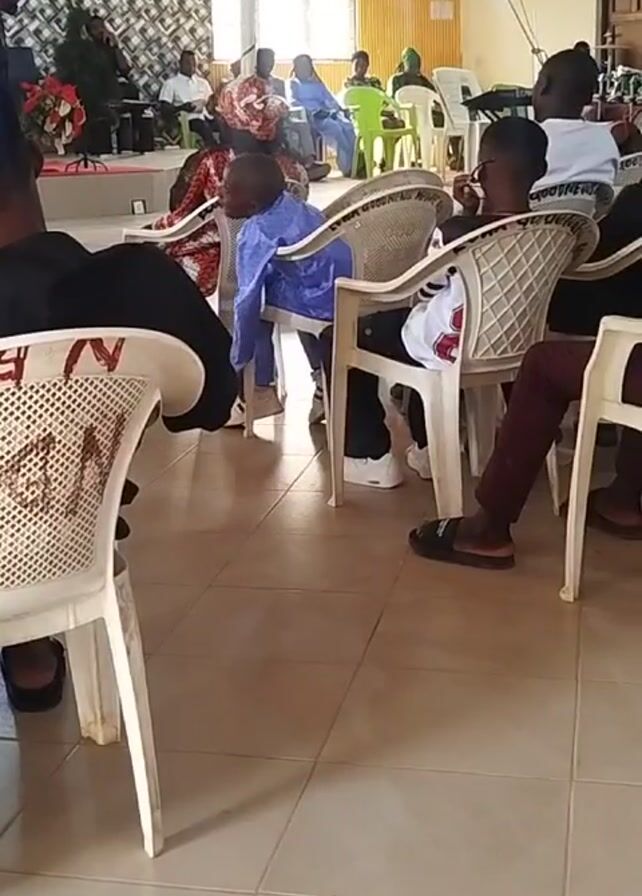group of people sitting in white plastic chairs in what appears to be a church or meeting hall. Most of the people are adults, but there is a small boy in a blue shirt sitting near the center of the frame. Some of the chairs have writing on the back. At the front of the room, there is a group of people on a slightly raised platform, possibly leading a service or presentation. The room is well-lit with natural light coming in from the window. The floor is tiled. A microphone stand is visible at the right.