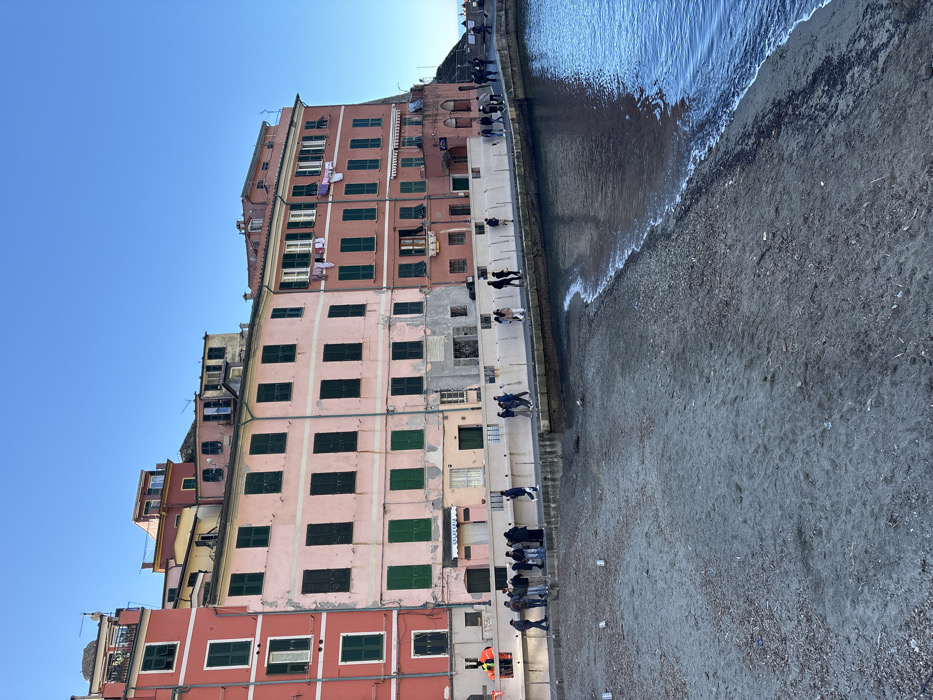 The image displays the waterfront of Vernazza, Italy, under a clear blue sky. A series of multi-story buildings, painted in red, pink, and terracotta hues, line the left side of the frame. The buildings feature numerous windows, predominantly fitted with closed dark green shutters. One pink building exhibits areas of peeling paint, and a terracotta building has several items of laundry drying on lines suspended from its upper facade. A white-lettered "GELATERIA" sign is visible on a shopfront in one of the lower floors of the pink building. A light-colored concrete promenade, approximately 2.5 meters wide, runs along the base of these structures, separating them from a grayish-dark beach composed of sand and small pebbles. The promenade gradually inclines upwards towards the right of the frame. Approximately twenty-five individuals are observed walking or standing along this promenade. They are dressed in various casual outerwear, including jackets and coats, suggesting cool weather. To the right, the deep blue water of the Ligurian Sea meets the beach, forming a distinct waterline with small, breaking waves. The water reflects the buildings to some extent. A small orange life ring is attached to a low wall section at the far left of the promenade. The perspective is slightly elevated, looking down towards the beach and across at the buildings and the activity on the promenade.