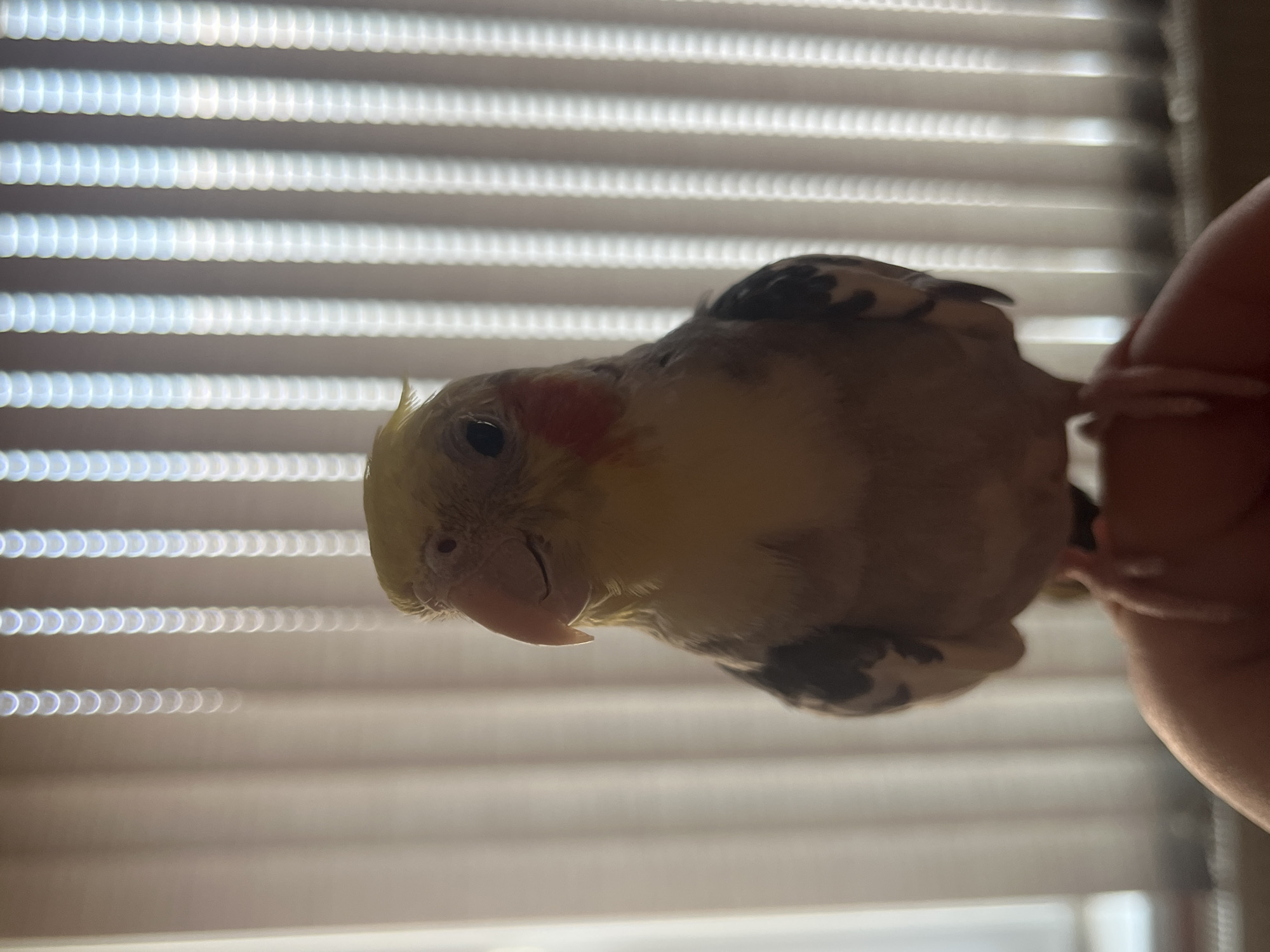 A cockatiel is perched on a person's finger. The bird has a yellow face with a red cheek patch, gray wings with black and white markings, and a short crest. The background is a blurred image of window blinds. There is no indication in the picture that it was taken in Kozloduy, Bulgaria.