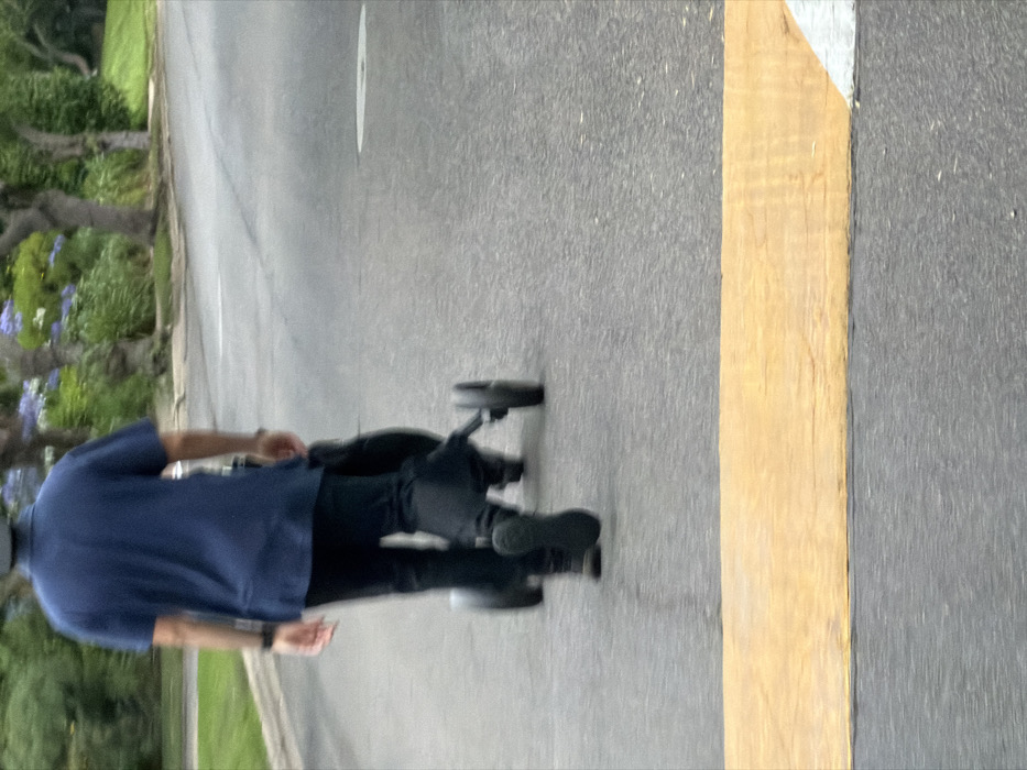 A man in a navy blue short-sleeved shirt and dark pants walks to the right, pushing a black stroller. He has dark shoes and appears to be wearing a watch. They are on a paved road with a yellow painted stripe on the right edge. Greenery, including trees and flowering plants, is visible to the left of the road. The image is slightly blurred and rotated.