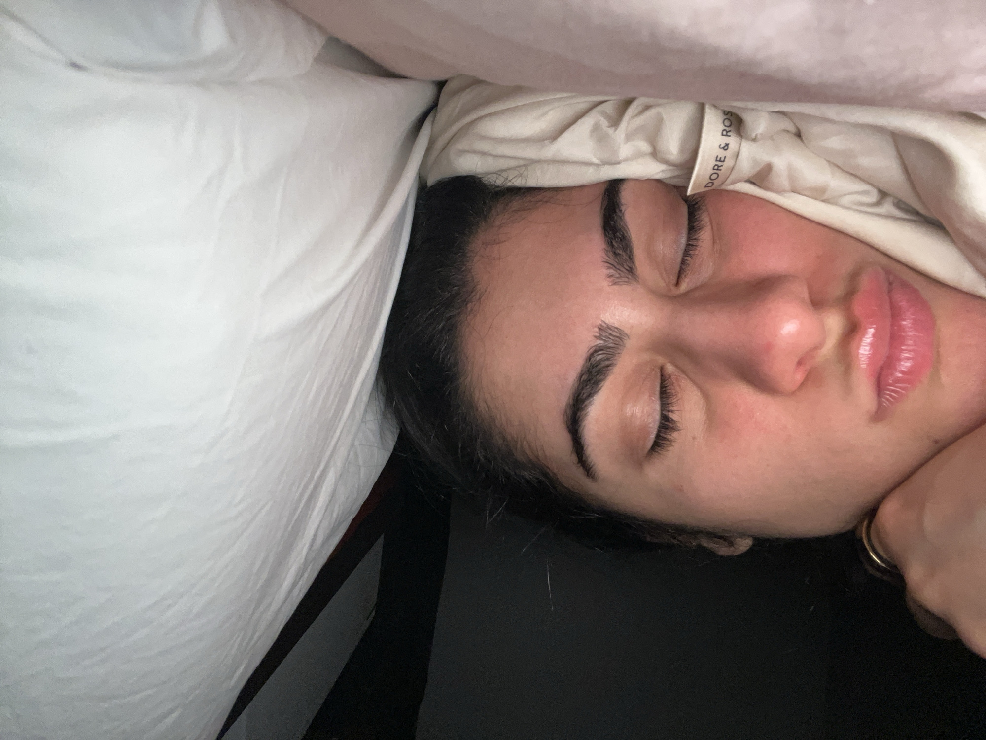 A female individual is depicted in a close-up, horizontal shot, lying on her right side with eyes closed, indicating sleep or rest. Her head rests on a light-colored pillow, revealing a tag that reads "DORE & ROS." Dark hair frames her face, which exhibits prominent dark eyebrows, full, glossy pink lips, and a fair complexion with noticeable redness on the cheeks. A gold ring is visible on a finger of her left hand, which is positioned near her head. To the right, a large white pillow with visible creases occupies the frame. The background behind the individual's head is dark, suggesting a dimly lit indoor environment, likely a bedroom. The presence of the "DORE & ROS" brand, a French luxury linen company, situates this scene in Paris, France.