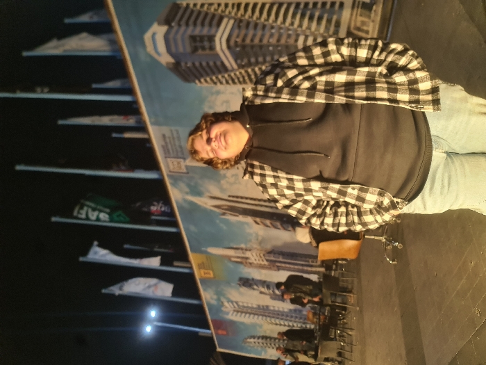 This image, taken at night in Shab'a, Syria, features a fair-skinned individual standing in the foreground, illuminated by artificial light. The individual has wavy brown hair and wears a black hooded sweatshirt layered under an open black and white plaid flannel shirt, paired with light blue jeans; their hands are in their pockets, and a slight smile is present. Behind this person, a large banner displays images of modern high-rise buildings against a blue sky, with partial text reading "SYRIAN [illegible] CONSTRUCTION" and "SAFI!". Above the banner, several flags on poles are visible against the dark sky, including a prominent green flag with "SAFI" displayed, alongside other lighter-colored flags. To the left of the main subject, several other individuals are gathered around tables and chairs on a paved surface, out of focus. A single brown chair with a chrome wheeled base is visible to the left. Two bright lights from utility poles are visible in the upper left, providing illumination to the scene.
