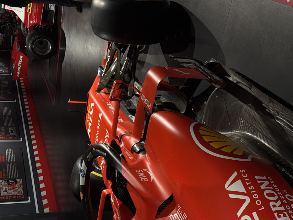 The image depicts the interior of the Ferrari Museum in Maranello, Italy