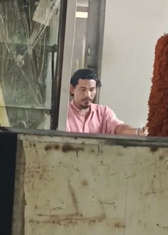 man in a pink shirt standing behind what appears to be a low, dirty wall, looking down. There is another man in a black shirt who briefly walks past the foreground. The setting looks like it might be an industrial or commercial area. There are glass panels and a red-brown, fuzzy object in the background, to the side of the man in the pink shirt. There is a sound of cheering in the background.