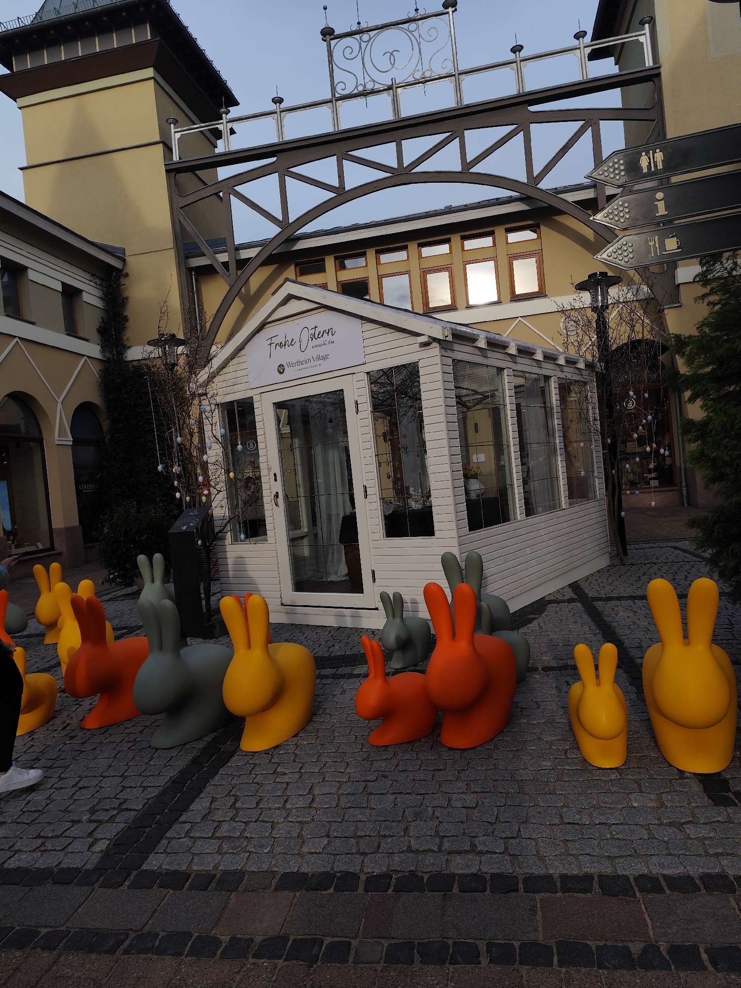 The image displays an outdoor pedestrian area within Wertheim Village, a retail outlet complex located in Wertheim, Germany. The ground is paved with grey cobblestones arranged in a rectangular pattern, featuring darker stone accents forming lines. In the center of the frame, a white, small, house-like structure stands, characterized by horizontal siding, multiple glass window panes, and a glass-paneled front door. Above its entrance, a sign reads "Frohe Ostern Wertheim Village." To the left of this white structure, a bare deciduous tree is decorated with numerous pastel-colored Easter eggs suspended from its branches. Adjacent to the tree, a dark, vertical rectangular pedestal is present, along with a black outdoor heating or lighting fixture. In the foreground and midground, scattered across the cobblestone paving, are numerous stylized, oversized rabbit-shaped sculptures. These sculptures are solid-colored, appearing in bright yellow, orange, and a muted grey-green. They vary in size, depicting both larger and smaller rabbits. On the far left, a person's lower legs and left foot, wearing a white sneaker and dark trousers, are partially visible standing near a yellow rabbit sculpture. The background features several multi-story buildings with light beige/tan facades. To the left, a building with arched doorways and rectangular windows is visible. Behind the central white structure, another building with multiple windows, some reflecting sunlight or bright sky, is present. In the upper left background, a distinct tower-like building with a light beige/tan body and a darker brown upper section and roof is prominent. An overhead dark metal archway with decorative scrollwork spans across the upper part of the scene, connecting architectural elements. Hanging from an adjacent structure are dark directional signs with white icons, indicating restrooms (male and female figures), information ('i'), and food/drink (fork, knife, mug). The sky above appears clear or lightly overcast.