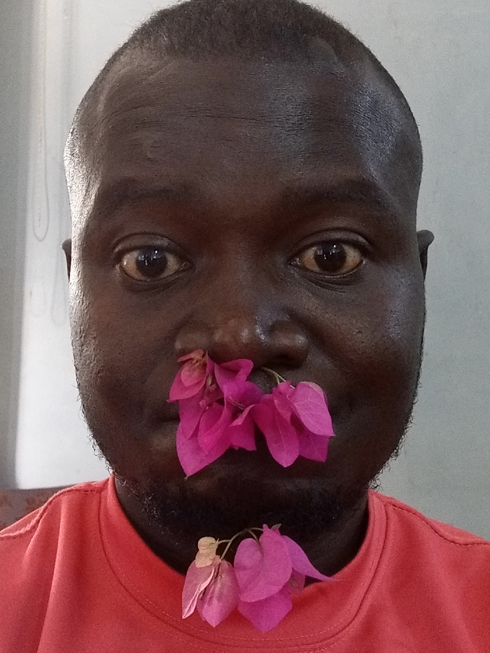 The image presents a close-up portrait of an adult male. His skin is dark, and his head is shaved or has very short, dark hair. His eyes are wide, with visible dark pupils and light brown irises, staring directly forward. Sparse dark stubble is visible on his chin and jawline. He is wearing an orange or coral-colored crew-neck t-shirt. Adhered to his face are clusters of vibrant pink bougainvillea bracts. One cluster rests over his nose, partially covering the nostrils. Another cluster is positioned below his lower lip, resting on his chin and upper neck area, partially overlapping the collar of his shirt. The background is a plain, light grey or off-white surface, suggesting an indoor setting or a simple wall. The location within the city of Dakata, Nigeria, is not discernible from the visual information provided in the image.