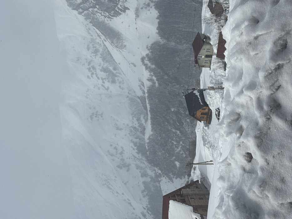The image depicts a snow-laden mountain scene in Gudauri, Georgia. In the immediate foreground, a substantial, uneven bank of white snow occupies the lower third of the frame. The midground features several buildings amidst deep snow accumulation. To the left, a multi-story building with a red-orange gabled roof and light-colored stone or wood siding is partially obscured by snow. To its right and slightly lower, a smaller two-story building with yellow-orange siding and a dark roof is visible. A dark-colored vehicle, possibly an SUV, is partially buried in snow next to this building. Further to the right, a light-colored two-story house with a reddish-brown roof stands amidst snowdrifts. Utility poles with overhead lines are present between these structures. The background consists of expansive, steep, snow-covered mountain slopes, sparsely dotted with dark trees, receding into a hazy, overcast sky, indicative of ongoing snowfall or heavy cloud cover. No individuals are visible.