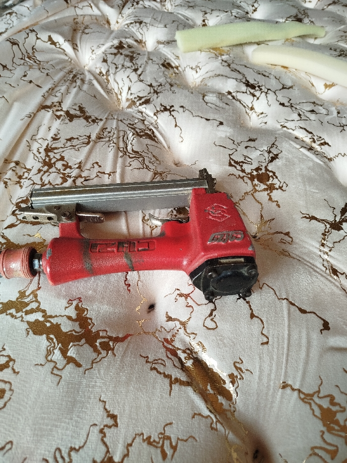 An upholstery project is underway, evidenced by a tufted fabric surface featuring a gold pattern. A red pneumatic staple gun lies on the fabric, suggesting ongoing work. Two pieces of foam padding are visible in the upper-right corner, ready for use. The scene indicates a process of furniture repair or creation, focusing on comfort and aesthetic appeal.