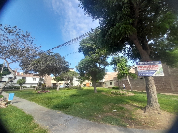 This image presents an exterior wide-angle view of a public green space, likely a park or plaza, situated within the city of Trujillo, Peru