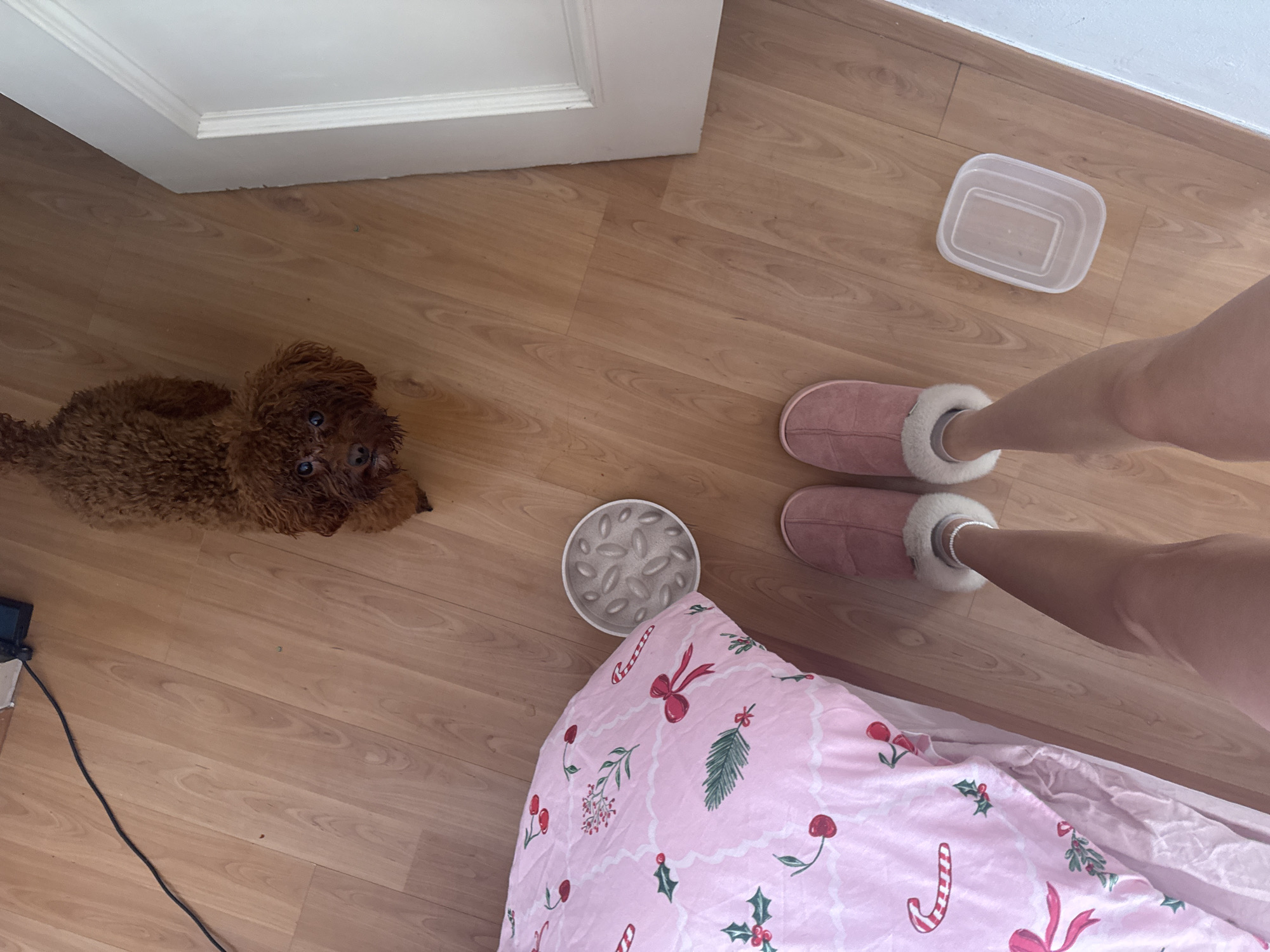 The scene depicts an indoor residential area in L'hospitalet De Llobregat, Spain, characterized by light brown laminate wood flooring. A small, brown, curly-haired dog with a damp face is positioned in the upper center, looking directly upwards. In the lower center, a person's bare legs, from the knee down, are visible, clad in pink, faux-fur-lined house slippers. A silver-colored anklet is present on the right ankle. To the left, a section of a bed covered with a pink duvet featuring Christmas-themed patterns (holly, candy canes, bows, cherries, and pine branches) is visible. Between the bed and the person's feet, an empty, round, grey slow-feeder dog bowl rests on the floor. A clear, rectangular plastic container with a lid is situated on the floor to the right of the person's legs. A black electrical cable runs across the floor in the top left corner, and a white door frame is partially visible on the right edge.