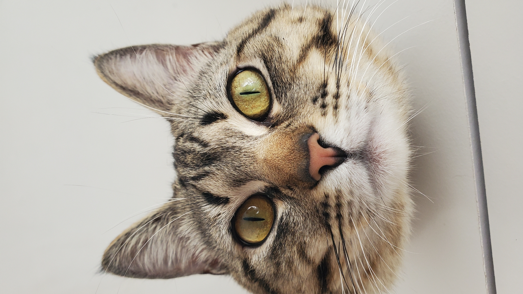 A close-up portrait of a tabby cat's head is presented at an angle, rotated approximately 90 degrees clockwise