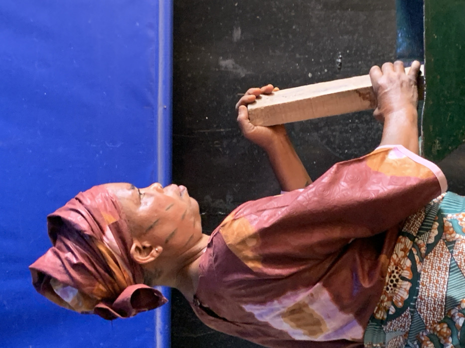 An older woman wearing a maroon and patterned headscarf and shirt holds a rectangular wooden block overhead with both hands. Her face, marked with dark lines, is angled upwards. A blue panel is visible to her left. Her patterned skirt adds color to the scene. The photo is taken at a tilted angle, giving a dynamic perspective.