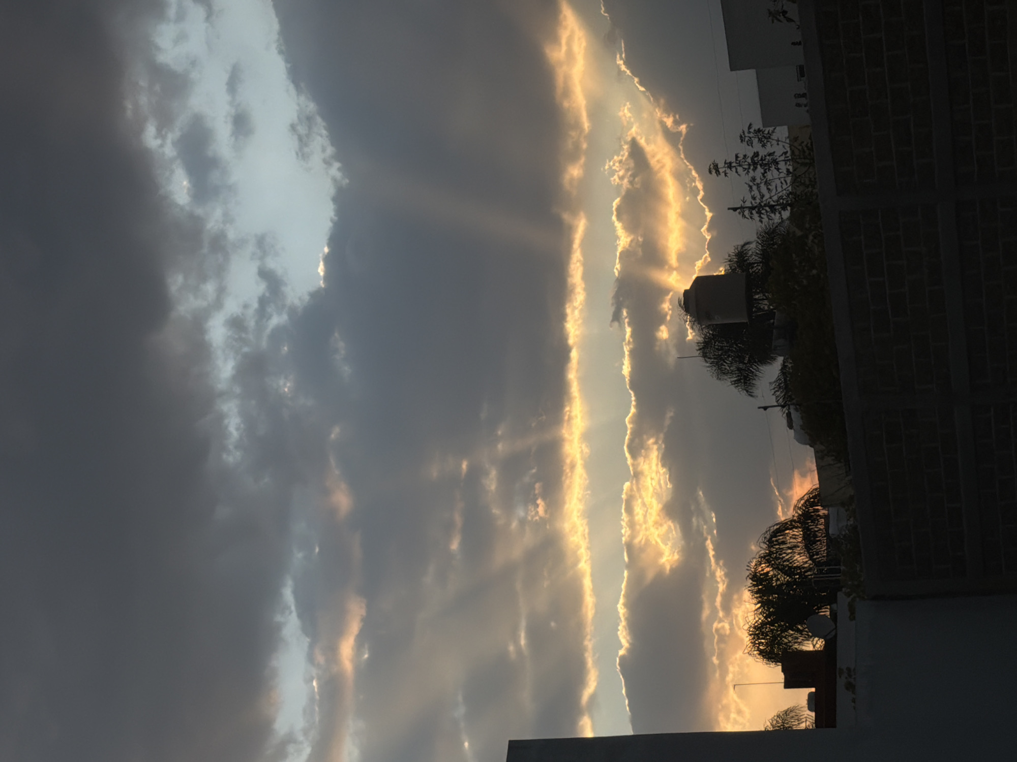 The scene captures a sunrise or sunset in Cholula, Mexico. The sky is dominated by multi-layered clouds, exhibiting a gradient from dark grey at the top to illuminated golden-orange at the horizon. Crepuscular rays are visible, fanning out from behind a central cloud bank. The lower third of the image is deeply shadowed, silhouetting urban elements. These include a partial light-colored building wall on the left, a dark brick perimeter wall spanning the lower center-right, and various rooftops. A beige cylindrical water tank on a support structure is prominently visible above the tree line in the mid-right. Dense, dark silhouettes of palm trees and other foliage are scattered across the midground. No individuals are present, and no discernable actions are taking place.