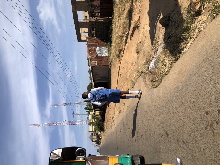 The image captures an outdoor scene on Rukuba Road, Nigeria. A paved asphalt road occupies the left and central foreground, with a partial view of a yellow and green three-wheeled vehicle's side mirror and body on the far left. A single individual, a young person, is walking away from the camera on the right edge of the paved road or an adjacent dirt shoulder. This person wears a white long-sleeved shirt, a blue outer garment (possibly a vest or sleeveless top), blue shorts or a skirt, white knee-high socks, and sandals, carrying a blue backpack. A distinct shadow from the person is cast on the road to their left, indicating strong sunlight. To the right of the paved road, the terrain is unpaved, consisting of dry, reddish-brown earth with sparse, dry vegetation. A row of structures constructed from corrugated metal sheets is visible along this unpaved section. Further back on the right, a partially constructed concrete building with exposed rebar and open window/door frames stands. A dark metal gate is also present in this area. In the mid-ground and background, two tall, red and white striped lattice communication towers are prominent against a clear blue sky with scattered white clouds. Overhead power lines span the upper portion of the frame, supported by utility poles along the road. Distant buildings are discernible on the left side of the road further down.