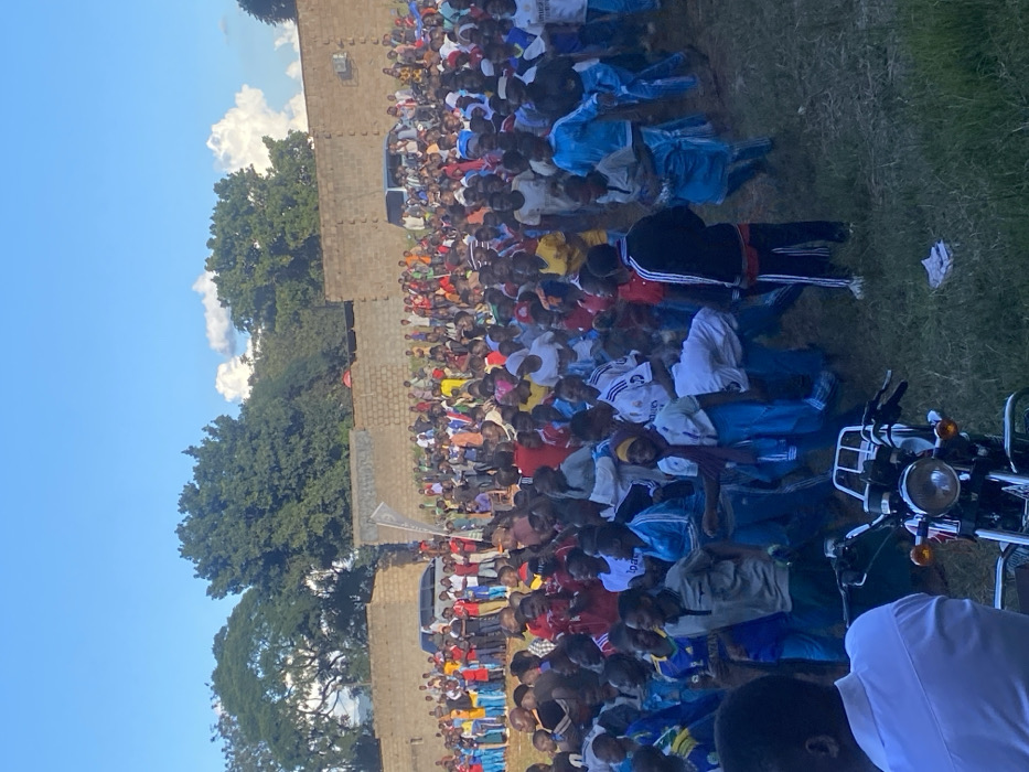 This image captures a wide outdoor scene in Mbinga, Tanzania, depicting a large gathering of people on a grassy field under a bright blue sky with scattered white clouds