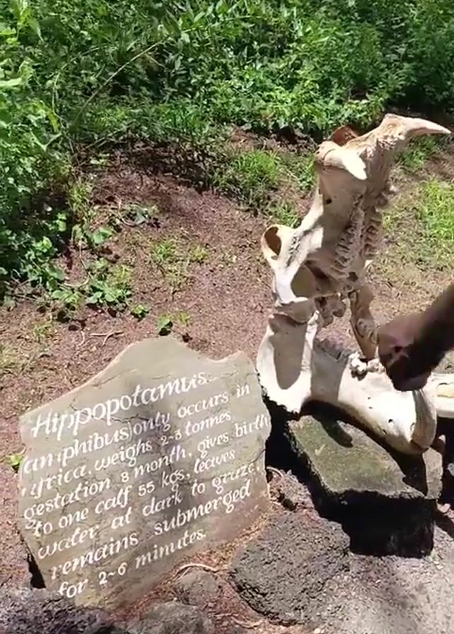 person interacting with a display of a hippopotamus skull in an outdoor setting. The hippopotamus skull, a large, partially assembled bone structure, rests on a small, dark-colored rock pile. Nearby, a gray, irregularly shaped rock slab displays information about hippopotamuses, noting their weight, gestation period, calving details, grazing habits, and submersion time. The background consists of green foliage and soil, suggesting a natural or semi-natural environment, possibly a park or zoo. The person's hand is visible as they reach to touch and slightly adjust the skull, indicating interaction with the display.