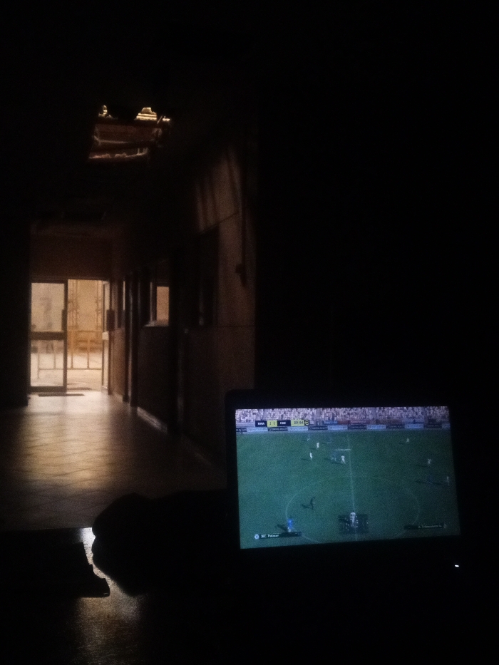 The image depicts an interior scene in Kakuri Gwari, Nigeria. In the foreground, positioned to the right, an illuminated laptop screen displays a football (soccer) game or simulation. The screen shows a score of "RMA 2 1 CBC" and a game timer at "20:54" with multiple pixelated players on a green pitch. The laptop itself is silhouetted. To the left, a dimly lit corridor extends into the background, exhibiting visible walls or paneling and a reflective floor. At the far end of this corridor, an open doorway reveals a brightly lit exterior area. A faint structural detail, possibly a ceiling opening or fixture, is discernible in the upper left quadrant. No individuals are present within the frame. The environment is characterized by low ambient light, with the laptop screen and the distant doorway acting as primary light sources.