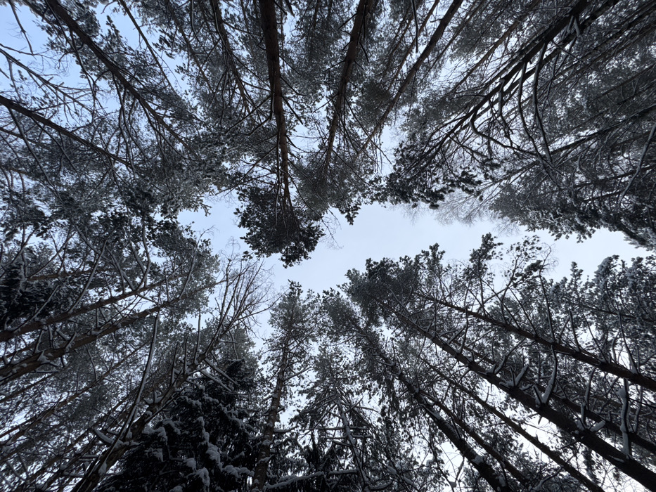 - "The image depicts a low-angle view looking directly upwards into a dense winter forest located in Капцёўскі сельскі Савет, Belarus" by FM-osXZC2, licensed under CC BY 4.0