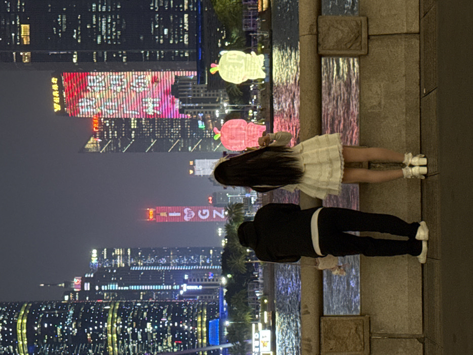 The image displays a nighttime scene overlooking the Pearl River and the illuminated skyline of Guangzhou, China, likely viewed from the Haizhu District towards the Tianhe District. In the foreground, two individuals are observed from behind, standing at a stone railing. The person on the left wears a dark hooded jacket, dark trousers, and white shoes, with a small white bag or pouch hanging on their left side. The person on the right has long dark hair and is dressed in a white short-sleeved top, a white tiered skirt with lace detailing, white ruffled ankle socks, and white block-heeled shoes. Across the river, numerous skyscrapers are brightly lit. A tall building on the far left exhibits vertical blue and white lights. To the right of center, another prominent skyscraper displays large red and pink Chinese characters on its facade, including "广州" (Guangzhou). A building situated between these two features a vertical "I ❤️ GZN" message illuminated in white and pink/red lights. Two large, glowing, stylized apple-shaped lanterns, one pink and one yellow, are visible on the distant riverbank. The river water below reflects the city lights.