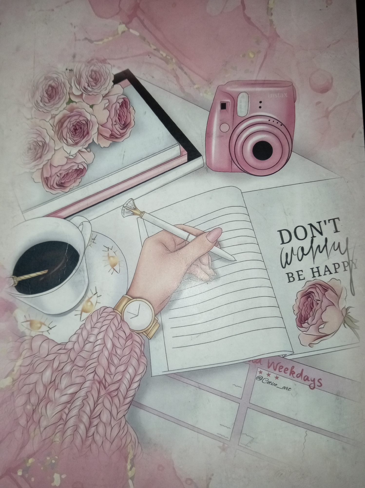 This is an illustrated flat-lay image depicting a stylized desktop scene in Parroquia Ocumare, Venezuela. The central subject is a light-skinned hand, emerging from a pink cable-knit sleeve and wearing a gold-toned wristwatch with a white face, holding a white pen with a clear, faceted crystal cap. The pen is poised over the ruled pages of an open notebook. To the immediate left of the hand is a white ceramic cup filled with a dark liquid, likely coffee, containing a golden stirrer, resting on a white saucer adorned with golden "eye" motifs. In the upper left quadrant, a cluster of six pink roses lies partially on a closed book or notebook with a black spine. A pink "instax" instant camera is positioned in the upper right. Adjacent to the open notebook, to the right, is a white card featuring the black text "DON'T WORRY BE HAPPY" and a single pink rose illustration. Below this, a section of a pale pink planner or calendar grid titled "Weekdays" is visible, including three stars and the inscription "@Cotico_art". The entire arrangement is set against a background of pink and white marbled patterns with gold vein-like accents.