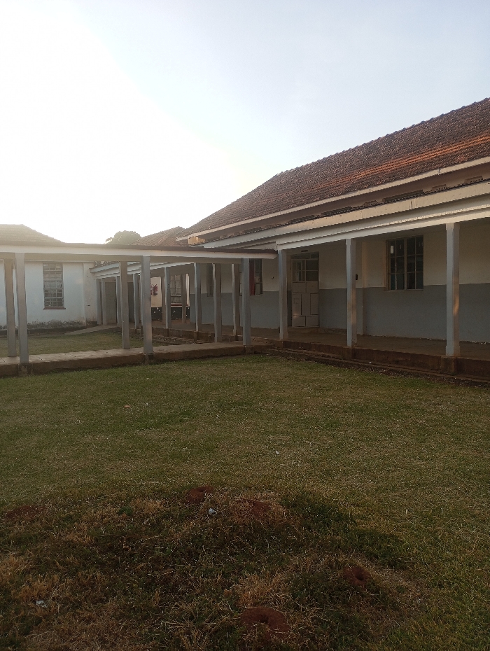 low-rise building with a red tile roof and a covered walkway supported by concrete columns. The building appears to be a school or institution with windows visible along the side. A courtyard with green grass is in the foreground, with a patch of dry grass and soil in the lower part of the image. The sky is visible at the top, suggesting an outdoor setting.
