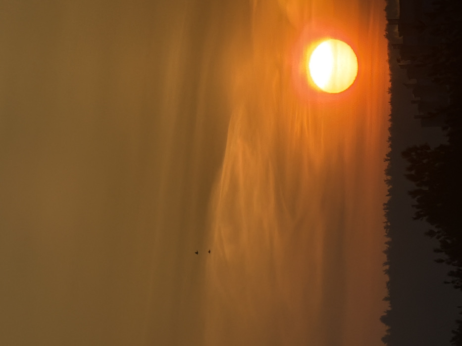 The image depicts a sunset or sunrise over the city of Chaikovsky, Russia, characterized by a dominant orange and golden color palette. The sky, covering approximately 70% of the frame, displays gradients from deep orange at the horizon to a lighter golden-orange towards the top, with wispy, horizontal cloud formations visible across the mid-section. The sun, a bright, intense circular orb with a white-yellow core and a distinct orange halo, is positioned in the lower right quadrant, partially obscured by the horizon line. Two small, dark bird silhouettes are visible in the upper-left sky quadrant, appearing to be in flight. The lower 30% of the image features a dark, silhouetted landscape: a dense, irregular line of trees dominates the horizon, with the dark outlines of multi-story buildings visible on the far right, suggesting an urban fringe. No individuals are discernible.