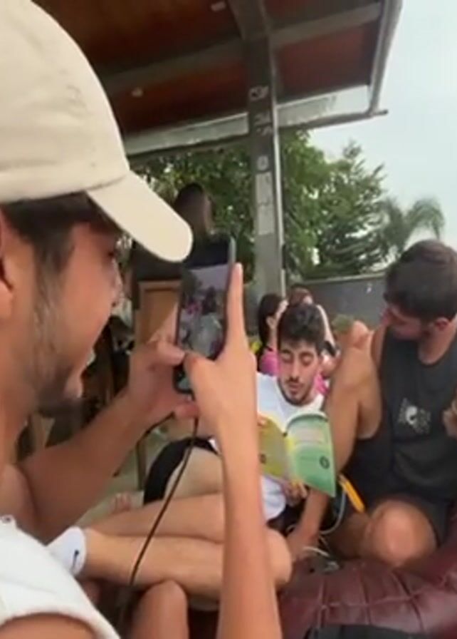 group of young people on a covered patio. In the foreground, one man is holding a smartphone and appears to be taking a photo of another man who is lying on a large brown cushion reading a book. A third man is seated next to him at a table, holding a coconut. The man with the phone is smiling and the man reading is smiling at the phone. Other people are sitting at tables in the background. The patio has a view of a green, forested landscape in the distance. The weather appears overcast.