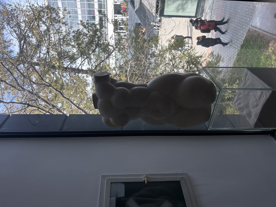 The image captures an indoor perspective looking out through a large window onto the campus of the University of National and World Economy (UNWE) in the Studentski grad district of Sofia, Bulgaria. In the interior foreground, an off-white, abstract, headless torso sculpture, characterized by rounded, bulbous forms, stands on a clear glass cuboid pedestal. The pedestal's base contains a layer of grey sand or fine aggregate. To the left, a framed object, possibly an artwork or display, with a visible light-colored latch, is partially visible against a white wall. Beyond the black-framed window, an outdoor pedestrian area is visible under a clear blue sky. The ground is paved with light-colored pavers, interspersed with patches of grass and sparse deciduous trees with bare branches. In the background, the multi-story modern building of UNWE is clearly identifiable. Approximately five to seven individuals are present in the outdoor space; three are prominently visible in the lower right walking away from the viewer, one wearing a red backpack. Sunlight illuminates the exterior scene.