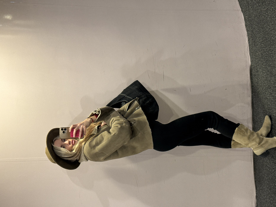 A woman wearing a tan hat, tan jacket with light fur lining, black pants, and tan boots takes a selfie using a smartphone with a bright pink case. A dark blue jean jacket hangs behind her. She is standing against a light pink wall, and a gray carpet is visible on the right side of the image.