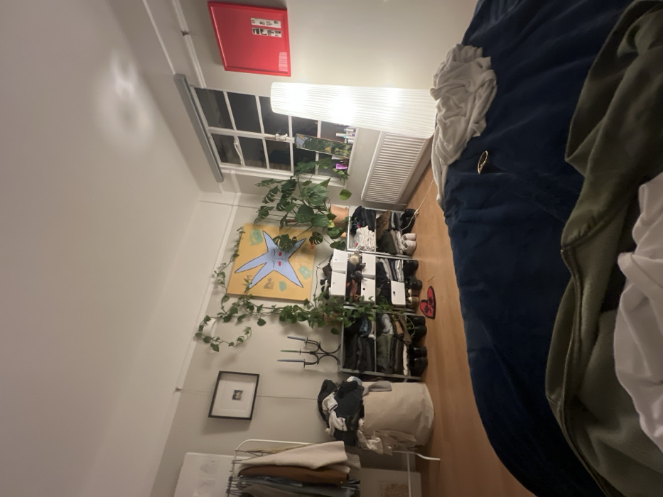 A bright room features a window with a red frame above. A large floor lamp shines near a radiator and shoe rack. A painting of a blue star on a yellow background is seen with green vines draping around it. A framed photo hangs below. Laundry sits piled on a bed, with a tan bag on the floor. The scene is from a slightly tilted perspective, possibly taken at an angle.