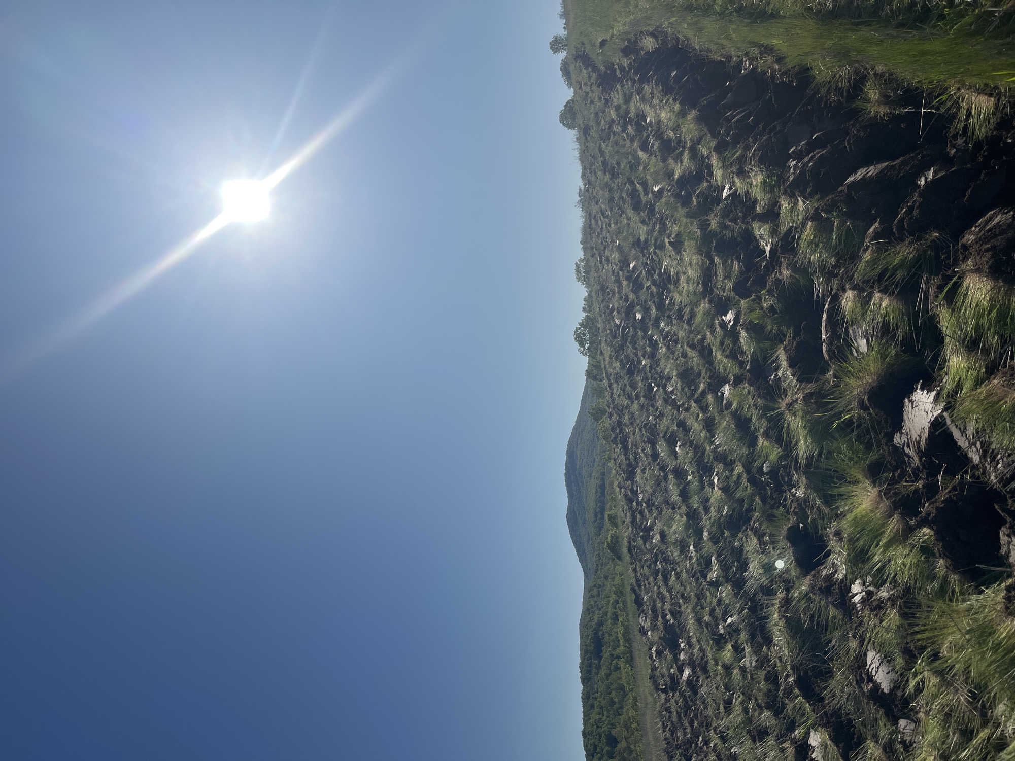 bright sun in a clear blue sky over a landscape near Belitsa, Bulgaria. The landscape appears to be a mountainside covered with rocks, grass, and trees. The photo is taken from a low angle, giving a wide view of the sky.