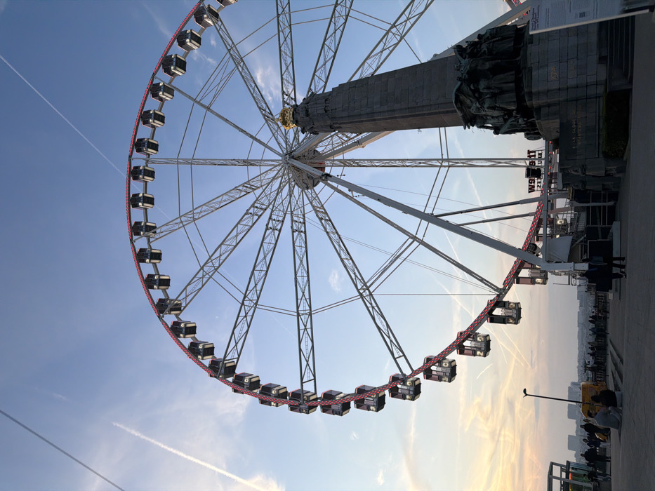 The image depicts an outdoor urban scene at dusk or late afternoon in Brussels, Belgium, specifically near the Congress Column on Place du Congrès. A prominent, large Ferris wheel dominates the left and center of the frame, featuring a steel spoke structure and approximately 30 dark-colored gondolas attached to a circular rim illuminated with red lights. Adjacent to the Ferris wheel, on the right, stands the tall, dark-gray stone Congress Column, topped with a golden crown. Its base is adorned with intricate bronze sculptural groups depicting human figures, and inscriptions are visible on its façade. The sky overhead is a clear blue, transitioning to a light orange and yellow hue towards the horizon on the left, indicative of a setting sun. Multiple white contrails from aircraft crisscross the sky. The foreground comprises a paved public square, dark gray in color, with several steps leading down to the left. Numerous individuals and small groups are present on the square; some are seated casually on the steps, while others stand or walk in various directions. A tall, dark streetlamp with a single light is visible on the left side of the square. In the distant background, a cityscape of Brussels is discernible under the fading light. A partial sign displaying "W9" and possibly "THE GRAND" is visible near the base of the Ferris wheel's support structure.