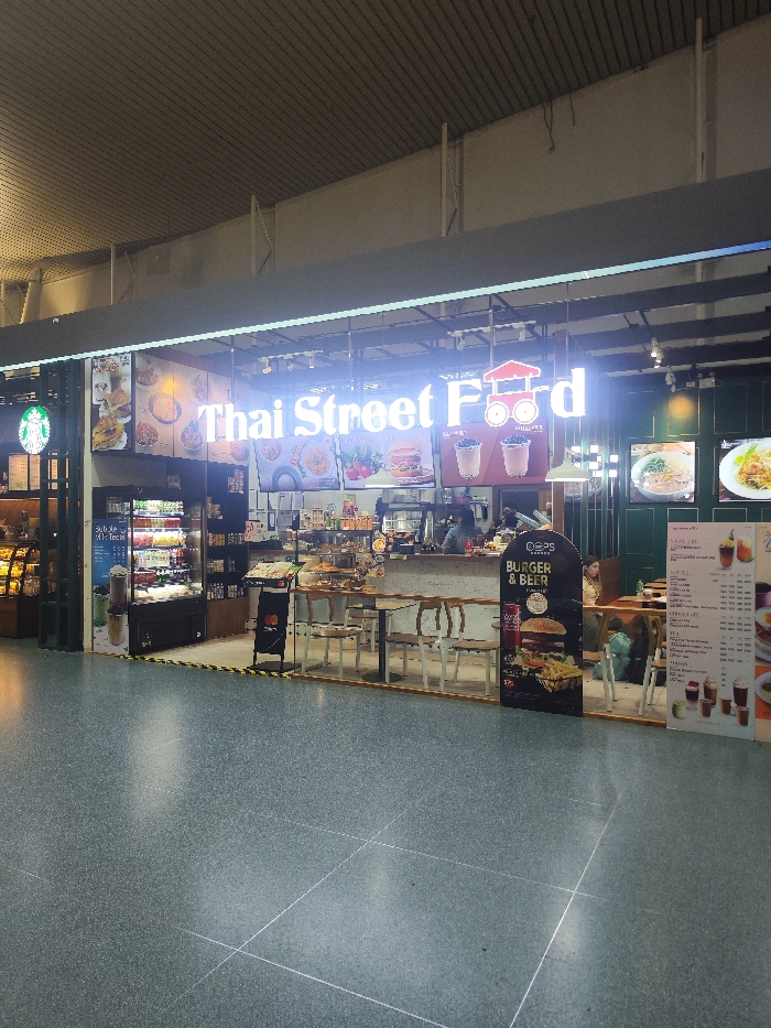 The scene depicts an interior view of a commercial food court or terminal in Tambon Sa Khu, Thailand, characterized by high ceilings and a grey speckled floor. In the foreground, a prominent glass-fronted "Thai Street Food" restaurant occupies the center-right, featuring a brightly lit sign with the restaurant's name and a red food cart logo. To the left of this restaurant, a Starbucks coffee shop is partially visible, identifiable by its green circular logo and a display case with baked goods. Inside the "Thai Street Food" establishment, several elements are discernible: * **Frontage:** The entrance is marked by a yellow and black striped tape on the floor. * **Displays:** A refrigerated display unit containing bottled beverages and other items is positioned near the Starbucks boundary. Further inside, multiple display cases showcase pastries and various food items. * **Counter and Seating:** A light wooden counter serves as the service area, behind which at least two staff members are present. Seating arrangements include small wooden tables with white chairs. One customer is seated at a table toward the back right. * **Signage:** Large digital menu boards display images of Thai dishes, burgers, and bubble tea. A standalone black A-frame sign promotes "O2S Burgers & Beer" with an image of a burger and fries. An additional vertical menu board with text and drink images is on the far right. * **Decor:** The interior features a dark green wall paneling on the right side with decorative sconces. The environment is brightly lit by overhead strip lighting, with reflections visible on the polished floor. The overall impression is that of a clean, well-maintained, and active commercial food service area within a modern facility.