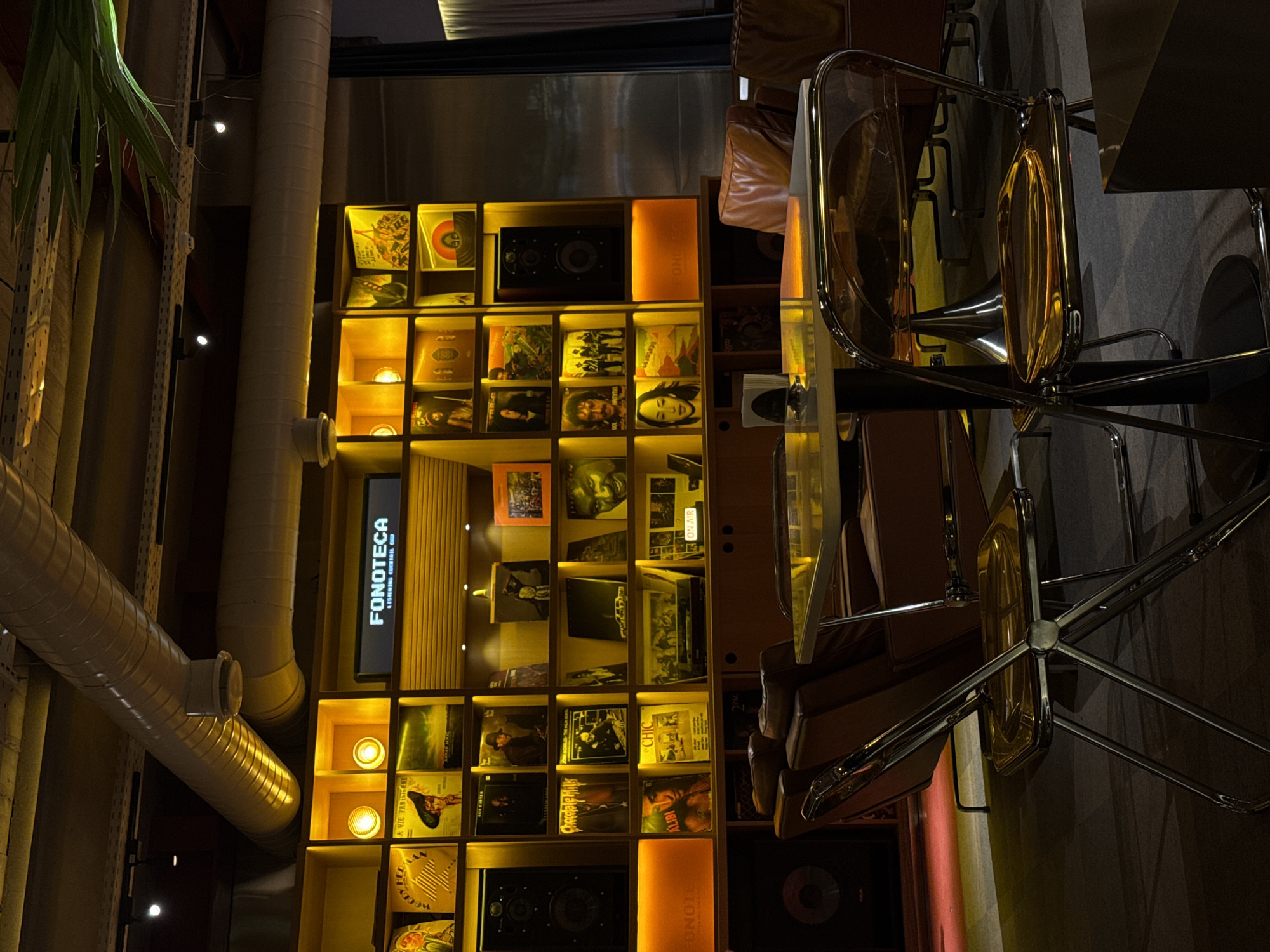 The image presents an interior scene with a notable record collection displayed in a modular shelving unit. "FONOTECA" is visible on a vertical sign, and various record covers are apparent within the shelves, including titles like "Woody", "A Vie Parisienne", "The Cars", "Chocolate Mills", and "Alibi". Some shelves house speakers and decorative lighting. A modern chair with a chrome frame is prominently featured in the foreground. The environment suggests a bar or lounge setting, possibly located in Yerevan, Armenia. The scene is dimly lit, with targeted lighting illuminating the record collection.