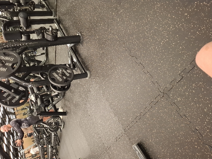 The image depicts an indoor gymnasium located in Varna, Bulgaria. The foreground shows a dark gray interlocking rubber floor with light speckles, partially obscuring the bottom right corner with a blurred, flesh-toned object, possibly a knee or thigh. In the mid-ground, numerous black "Hammer Strength" brand weight machines are present, equipped with various weight plates. Visible plates include "25 KG" and "1.5 KG" denominations with "STRENGTH" branding. To the left of these machines, a bald adult male, wearing a dark patterned long-sleeved shirt, black shorts, and white athletic shoes, is holding a circular weight plate with both hands. In the blurred background, additional gym equipment, including dumbbell racks and other strength training apparatus, extends across the facility. Other individuals are faintly visible in the background, engaged in activities within the gym environment. The ceiling features a structured, possibly corrugated, design with overhead lighting.