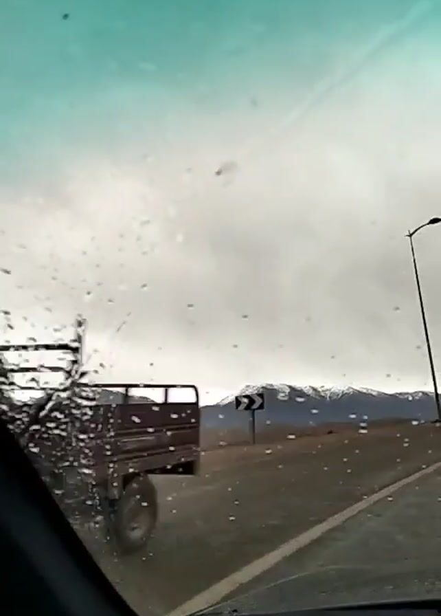 view from inside a car driving on a paved road on a cloudy, possibly rainy day. In the distance, mountains can be seen with snow-capped peaks. At the beginning of the video, a person on a three-wheeled motorcycle-like vehicle is visible on the side of the road. The road has a white dividing line. Later, there is a road sign indicating a turn. A street lamp is also visible. The video progresses to show a small town with uniformly colored buildings against the backdrop of the snow-capped mountains. The windshield of the car is covered with water droplets.